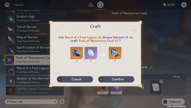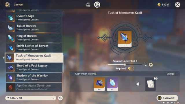 In the convert menu, players can find five-star talent level up materials they currently have from the weekly bosses. Click on the material that you want. For me, I wanted Tusk of Monoceros Caeli for my Zhongli.