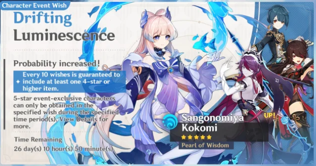 Kokomi’s official banner and the featured four-star characters are yet to be revealed by miHoYo. However, as always, her banner was leaked ahead of its launch, and thanks to that, we do know the featured four-star characters that players can get while wishing on the Drifting Luminescence banner.