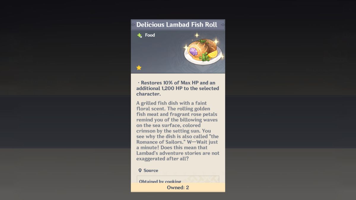 Like any other dish in Genshin Impact, you can cook the Lambad Fish Roll at any cooking station. Select the dish and click on the Cook button. Stop the moving pointer in the orange zone to make the perfect Lambad Fish Roll.