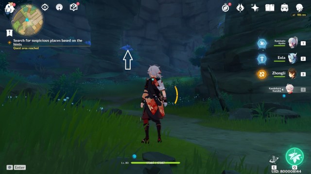 When players get to this section of the Lasting Promise quest, they have to search for suspicious places based on hints. The door is found near the blue shrubs as marked in the above screenshot.