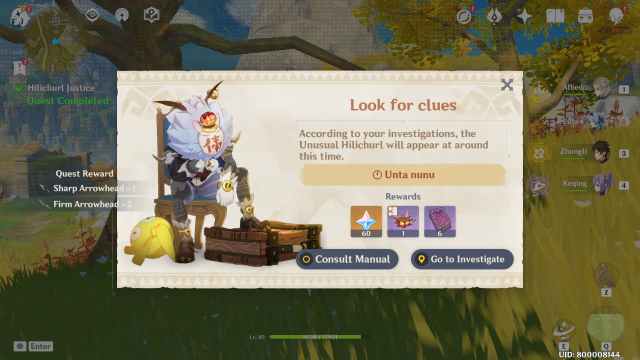 Defeat the Unusual Hilichurl within designated time to complete the investigation. Once that is completed.