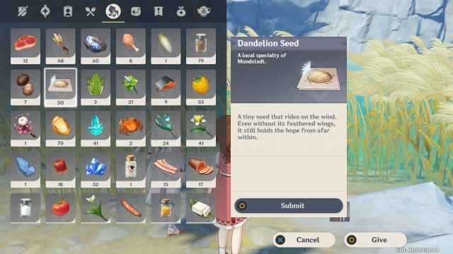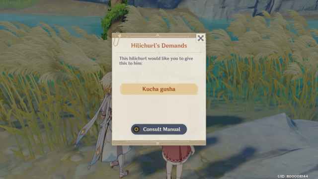 This time around, the Hilichurl will ask you for an item called “Kucha gusa”. Give him a Dandelion Seed to progress through the quest.