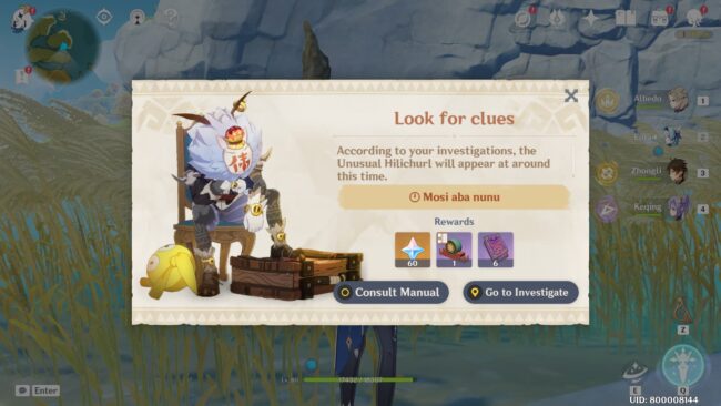 Assuming you have reached this far in the Genshin Impact sighting 5 event quest, you will have the Unusual Hilichurl location marked on your game map and the time when he appears in the marked location.