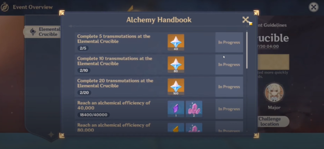 The new crucible co-op event in Genshin Impact will have travellers working together to shovel elemental clots into an “Elemental Crucible” to advance an alchemical process. And after the alchemical process is complete. Players can use their in-game resins to claim the sweet rewards that even grant you free primogems(via alchemy handbook).