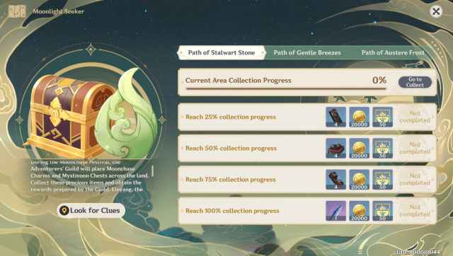 In the Moonlight Seeker section of Genshin Impact’s Moonlight Merriment event, players have to find and collect a given number of Moonchase Charms and Mystmoon Chests to earn rewards, including the Luxurious Sea-Lord Claymore.