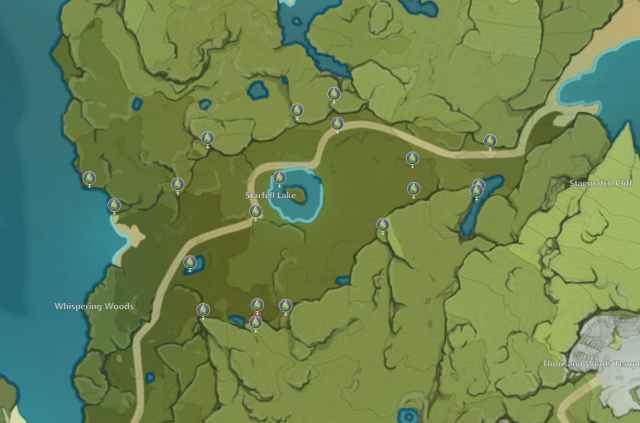 The Path of Gentle Breezes search of Moonchase Charms will take players to the area around Starfell Lake. In the above, Genshin Impact map, you will find all twenty Moonchase Charms locations.