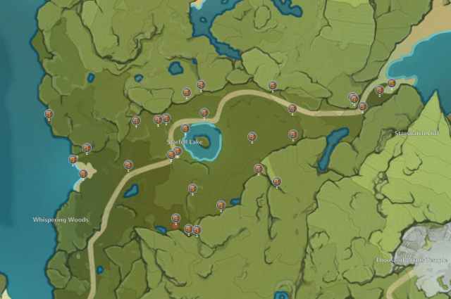 Your search for Mystmoon Chests in Path of Gentle Breezes will take you to the area around Starfell Lake. In the above, Genshin Impact map, you will find all thirty Mystmoon Chests locations.
