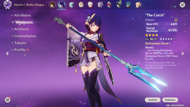 The Raiden Shogun’s signature weapon, Engulfing Lightning, is the best weapon for her. Its sub-stat increases the Energy Recharge% of the character wielding the weapon and its weapon ability, Eternal Stove – increases the ATK by 28% of Energy Recharge over the base 100%.