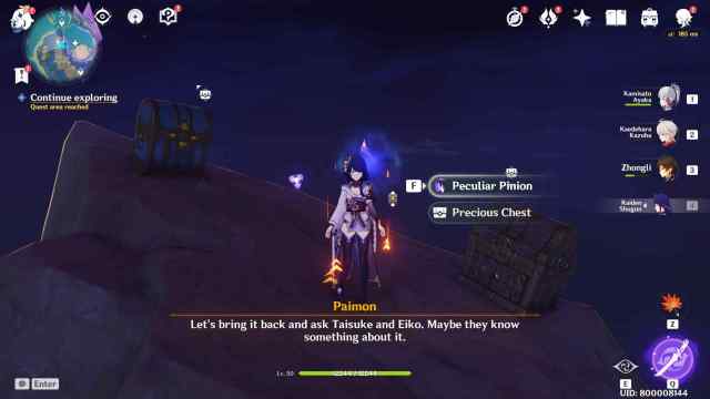 Once you reach the top, you will find a feather called Peculiar Pinion. It is the root cause of the storm anomaly on Seirai island. Collect the feather and the nearby precious and luxurious chest.
