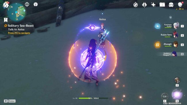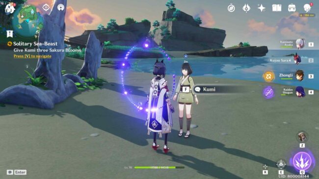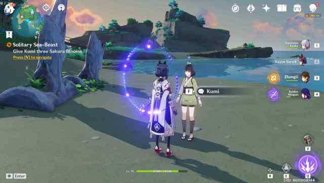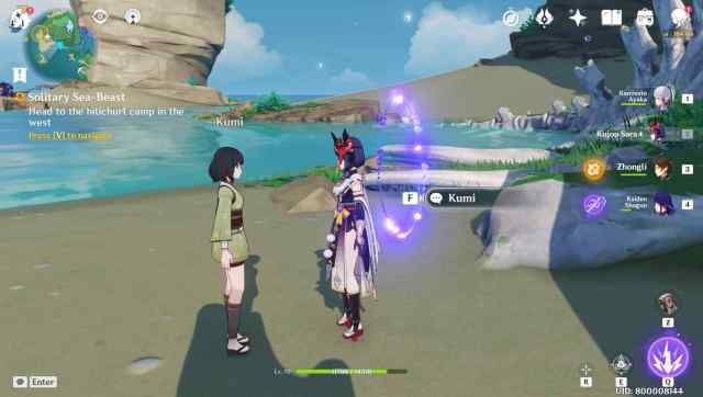 As we mentioned earlier, players can get the Solitary Sea Beast world quest by talking to Kumi. She is found near the giant fishbone found south of Mouun Shrine. To get there, teleport to Watatsumi Island Statue of Seven and head towards the beach. There you can find Kumi.