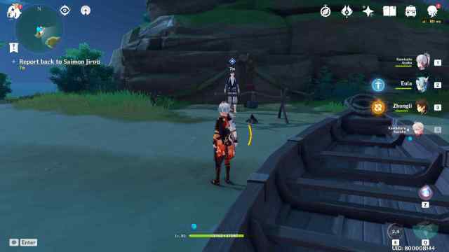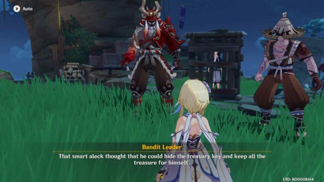 When you go back to Saimon Jirou to confront him about his lie, you find him captured, once again. The Bandit leader will tell you about how Jirou scammed them and all that. Once you have exhausted their dialogues, defeat the Bandits and the Fatui.