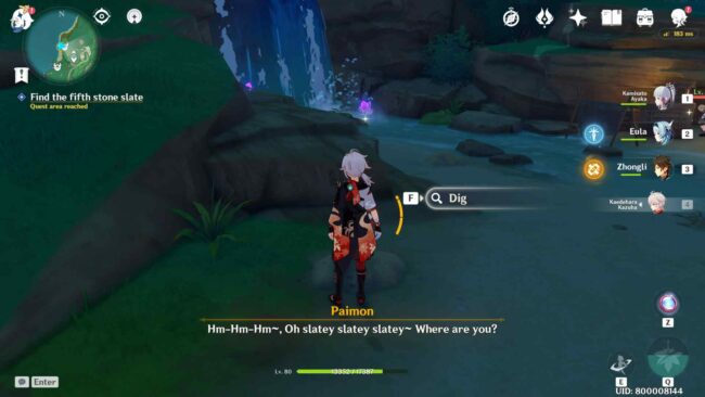 Go to the marked location and dig the ground for the fifth stone slate. You won’t find any, because, Saimon Jirou just fooled you.
