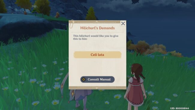 Once you reach the marked location, talk to the Hilichurl. This time around, the Hilichurl will ask you for an item called “Celi Lata” which translates to “Things such as fireflies, stars or the moon”.