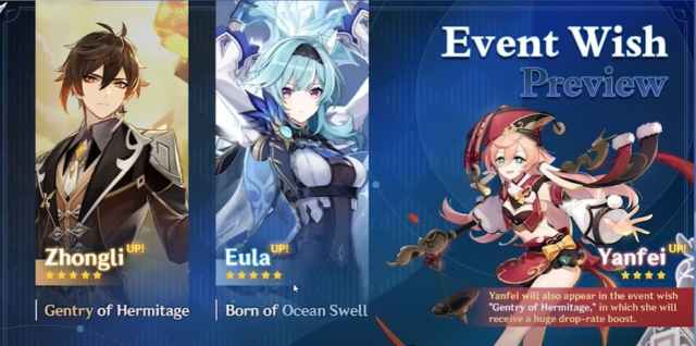 [Update on April 19, 2021] Eula’s event wish banner may feature Xinyan, Xingqiu and Beidou as featured four-star characters.