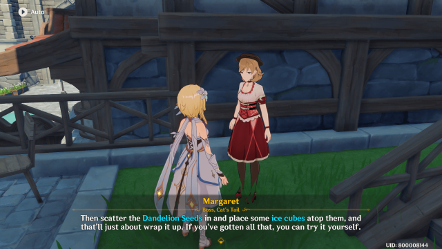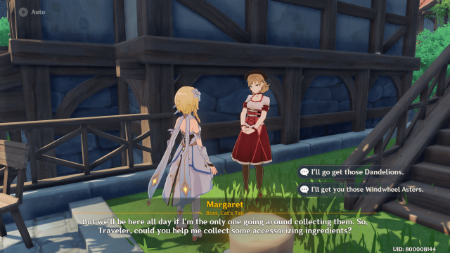After talking to Margaret, you are given two choices, whether go look for Dandelion Seeds or Windwheel Asters. Depending on your choice you are given a location to look for the said item.