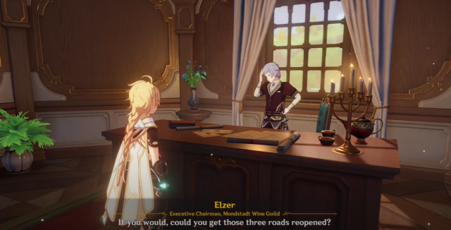 Upon interacting with Elzer, players come to know that the three roads leading to Dawn Winery have become impassable due to storms. And on top of that, monsters have taken over the road for some unknown reasons. So, as the honorary knight and a skilled adventurer, Elzer asks players to reopen the roads – and there begins our Windrise Windfall world quest.