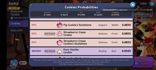 If you check out the probability, the odds of drawing the Strawberry Crepe Cookie are 0.085%. The odds of drawing its Soulstone are 0.482%.