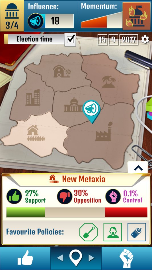 But back to Head of State! You will spend most of your time looking at the map of Concordia and collecting influence points from there which you will later use to adopt social policies or improve the control you have over the population and opposition. Concordia is made up of 5 states, each with its own preferences in terms of policies – so there’s a bit of micro-management and planning involved as well. It’s true that Low Taxes might sound good for everybody, but if one state would rather have free education, you might want to choose a different path.