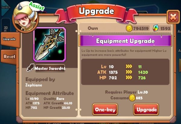 I didn’t really take advantage of this feature, but it’s extremely helpful. You can level up your Equipment by tapping it in the Hero menu where it’s equipped. This is definitely something worth doing – and something I wasn’t aware I could do, so I spent a lot of time fighting with level 1 equipment.