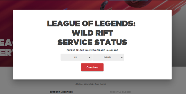 - Click Continue and check for any server downtime in the Current Messages tab.