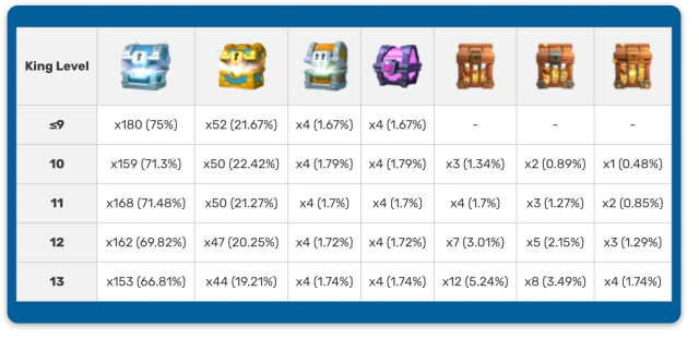 There are even King Level Chests, which a player gets when his King Level increases. When you get to King Level 11, a small amount of Silver and Golden Chests are replaced with Gold Crates, Plentiful Gold Crates and Overflowing Gold Crates, and some Silver/Golden Chests are removed completely, trimming the cycle.