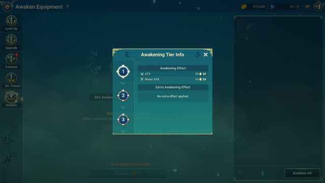 While you are in the Awaken menu, you can select the equipment you want to Awaken from the right-side menu. Once that is done, select a copy of the same equipment to Awaken. Keep in mind, that to successfully Awaken any equipment, you will also need a certain amount of Gold.