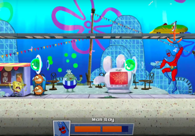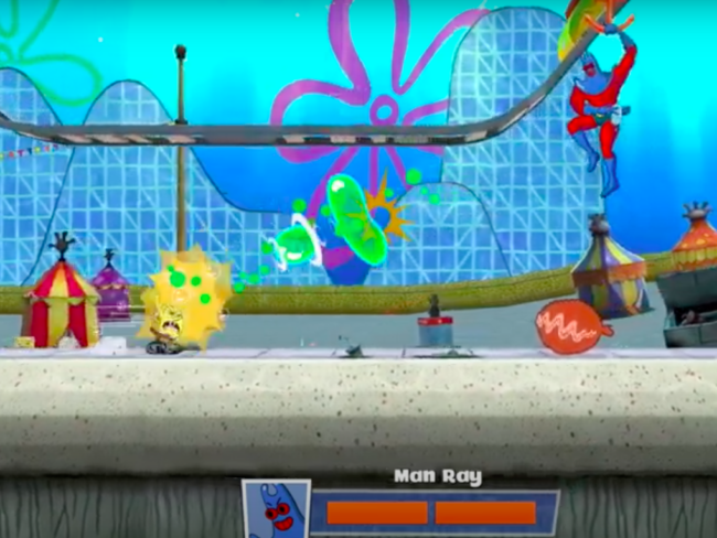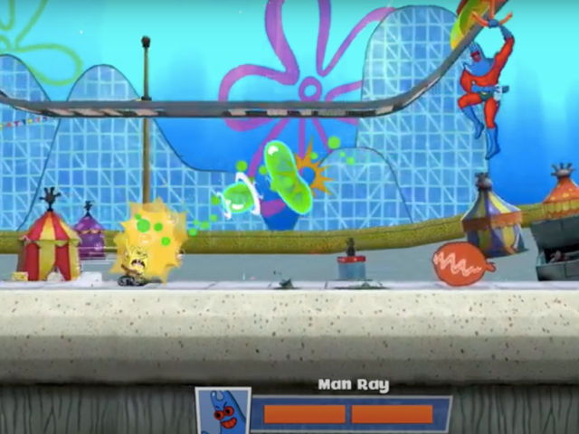 Man Ray is one of the bosses to beat in Spongebob: Patty Pursuit. In the original cartoons he is the arch-nemesis of Barnacle Boy and Mermaid Man, but in this platform fighting game it is Spongebob who must defeat him! He appears in the Carts Mania level in Glove World, hanging from an anchor on some tracks. Man Ray throws toxic bubbles at Spongebob, which will need to be dodged or destroyed. Find out how to defeat this villainous villain below!