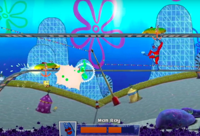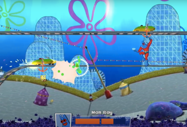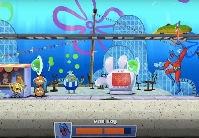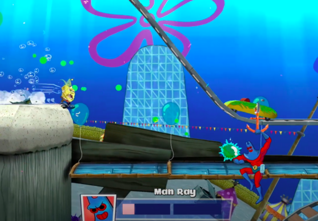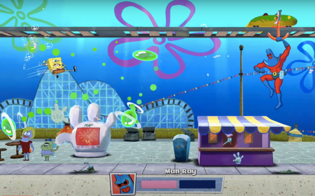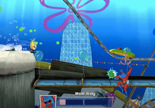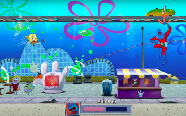 Next Spongebob has to jump and kick to reach bubbles being thrown his way and deflect them towards Man Ray.