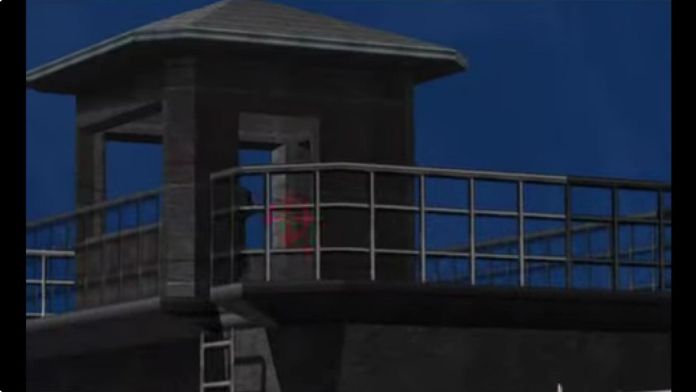 The guard tower will emerge from behind another guard after a few moments. If you shoot him in the head with one shot, he will not be able to spot you. To reach the top of the guard tower, climb up the stairs on the left side. You can find a rifle (sniper) in the middle of a glass-enclosed room here. It is simply a matter of shooting the glass enclosure and picking it up.