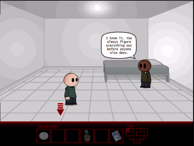 Now, enter the room labeled SUBJECT #1831. Hover your mouse on the room’s right wall to find an entry to the secret room. Get the steak from the secret room and leave the room now.