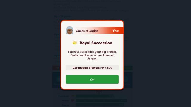 Once you’ve chosen any of the countries above, the next part involves some randomness. Start a life as a female, then hope that you’re born into the royal family. There is a very small chance of this happening naturally, which can be annoying because you just have to keep restarting until you get it.