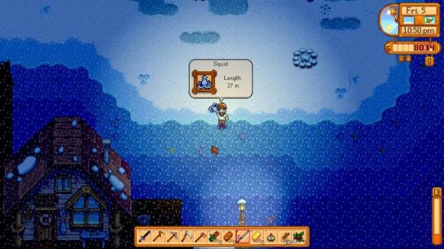 You can catch the Squid from the Beach or Beach Farm whenever it’s winter. The Squid is available from 6 PM to 2 AM and unlike most fishes that are only available to catch when it’s raining, you can attempt to catch the Squid in any weather conditions.
