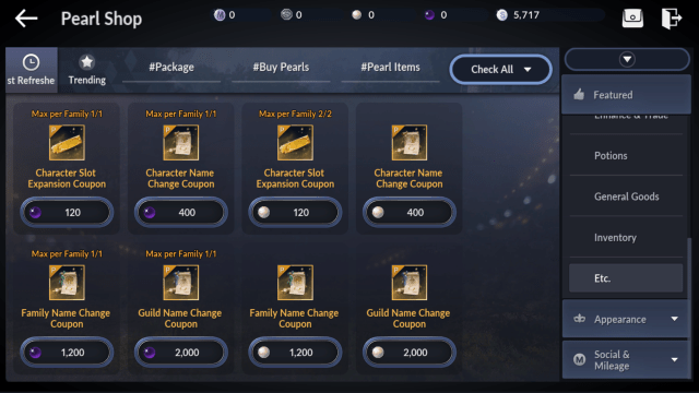 Moving forward, to change the family name, players will have to purchase the Family Name change coupon from the in-game store. Navigate to the Etc section of the store page (Pearl Shop>Misc.>Etc). There you can find the Family name change coupon for 1200 pearls. Buy the coupon and it will move to your Pearl inventory.
