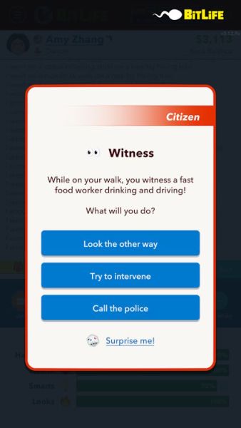 When you do encounter someone, and you’re given a list of responses, pick the one that sounds the most confrontational. For us, we saw a fast food worker drinking and driving, so we intervened and got into a fight with him.