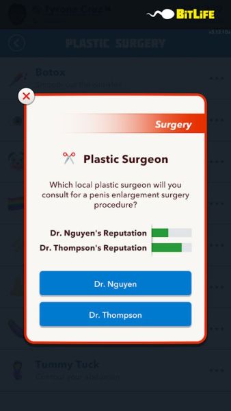 You are asked to choose between two doctors with varying reputation, much like seeing your regular doctor. Plastic surgery is actually very dangerous and botched surgeries can kill your character, so always choose the doctor with the higher reputation.