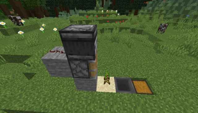 When the observer notices bamboo’s growth, it powers the piston to break bamboo. The broken bamboo is then collected by hopper into a chest. Players can make rows of multiple bamboo farms and gather all bamboos in one chest.