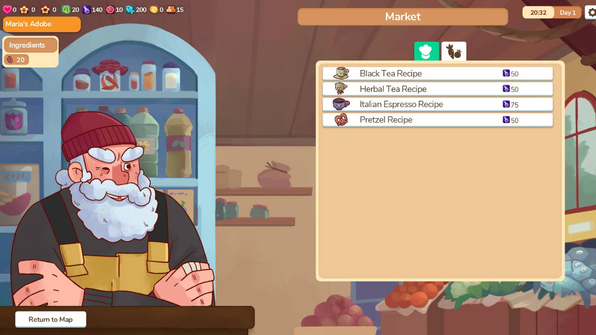 In the Market, you can purchase recipes and ingredients. Everything in the Market costs Nectar, the purple potion resource. Witches pay in Nectar, so if you want to buy lots of recipes, make sure that your café is attracting Witches.