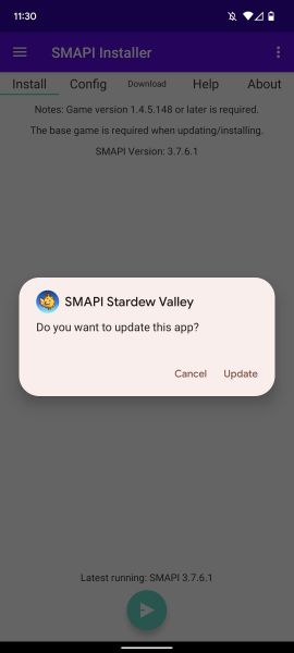 Any downloaded mods will appear in the SMAPI Installer config tab. Use the mods by tapping the green arrow in this tab! Remember: you must run the Stardew Valley via this app, and not via the regular main Stardew Valley app to use the mods.