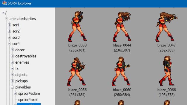 SOR4Explorer should now show a list of the game’s assets. You can use this tool to browse the sprites for all major characters, and you can also swap out files. This is the key to installing mods, as you’ll be overwriting existing character files.