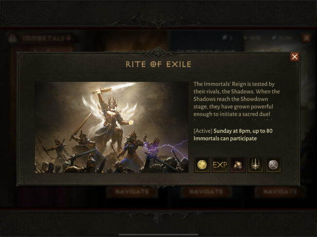 To participate in the Rite of Exile, you must first join the Shadow faction. Then you will need to put a lot of effort and time into becoming useful to your Dark Clan. During the Rite of Exile, 8 best players are selected from the top 10 Dark Clans to fight in PvP battles with the Immortals. So, if you want to enter Rite of Exile, you must become one of the best players in the best Dark Clans. After that, you will just need to wait for the start of Rite of Exile.