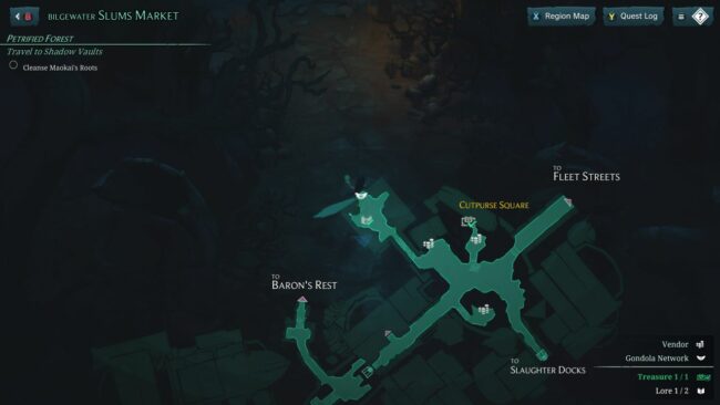 To unlock fast travel, you will need to play the main campaign until Miss Fortune joins Illaoi, Braum, and Yasuo, at around 40% story progression. Once this happens, you can start exploring Bilgewater freely in search of side quests and treasure, and use the Gondola service to move from one district to another. You can use the Gondola to move between a limited amount of locations inside Bilgewater, as highlighted by a specific icon on the map, as shown in the image above, so you will have to move on foot if you have to get to a location not served by the Gondola.