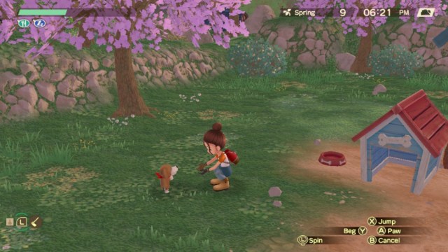 Dogs can learn different tricks such as Beg, Jump, Spin and Paw. To train them, stand by them and press the Y button. Choose from one of the four tricks to work on. If you see the dog react with a cloud above its head and not a heart, it means they’ve had enough of practicing for the time being. When you train them, they can do things like chase away the occasional invader. They’re a great pet and companion to have.