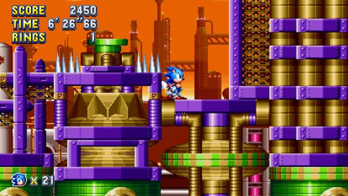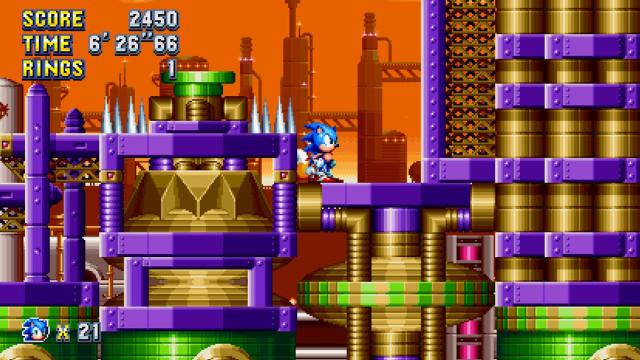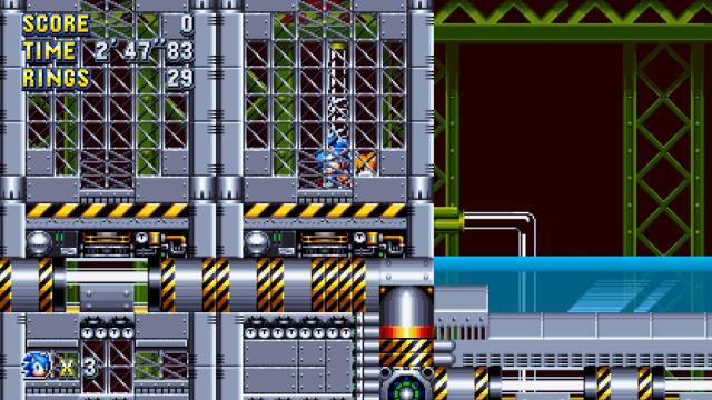 For the next one, stick to the top path. You’ll find a chemical pipe that leads down, next to an iron grate. Spin-dash down this pipe, as you want to build up as much speed as possible. As you hit the curve at the end that shoots you high up into the air, hold left to land on the platform with the giant ring. You only get one shot at this!