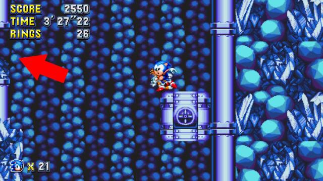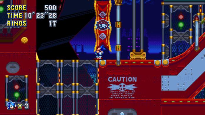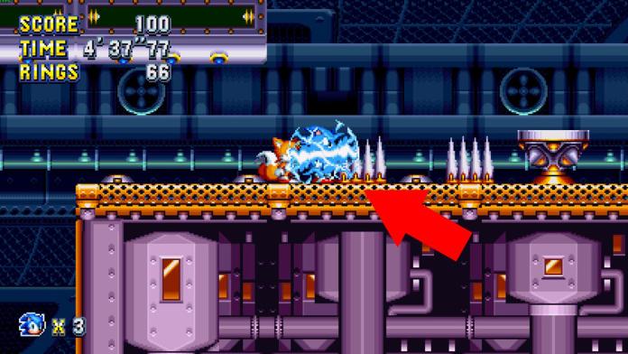 From the previous giant ring, backtrack and head up on the conveyor belt. You’ll see a small curve with a flamethrower on top—spin-dash into it and hold left to land on a platform.