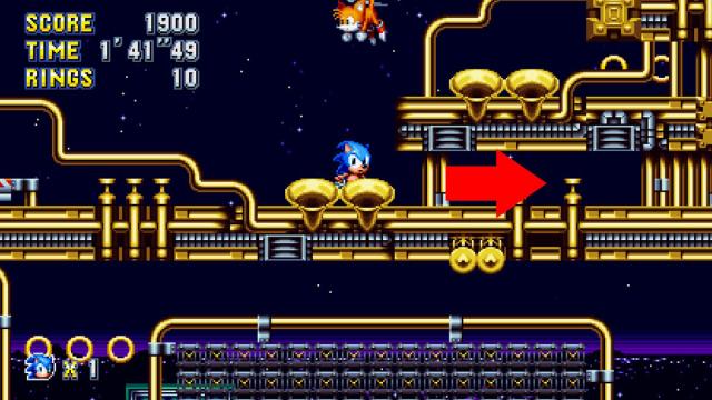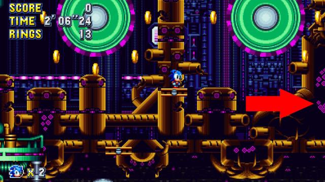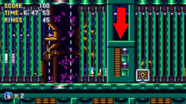 This is the giant ring you’ll find if you stick to the top path. You’ll come across this section of fluid pipes with springs on the end. When you get to this spring, don’t hit it and instead jump above it and go to the right through a hidden wall.