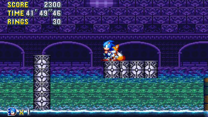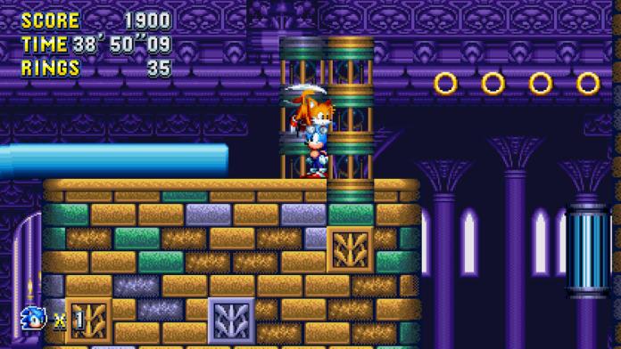 Stand on the platform to your right, face left, spin-dash, and then jump as you approach the edge. If you do it right, you’ll hover across the fan and grab onto the spinning pole above the blades. Go up the pole, and swing to the right. Keep going until you reach a chain. Grab onto it, and it’ll pull you up to the giant ring.