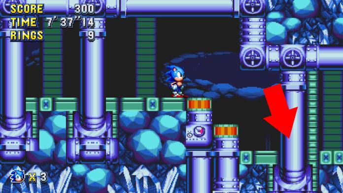The next one is for Knuckles only. From the previous giant ring, head down instead of up. You’ll come across a rock barrier that only Knuckles can break, so spin-dash through it.