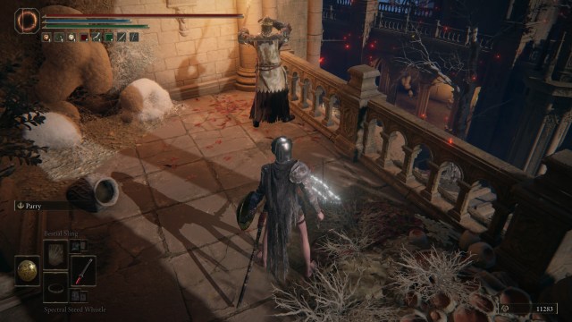 Keep following the path till you reach the soldier standing near the balcony. As shown in the above image, jump off the stone fence onto the path.