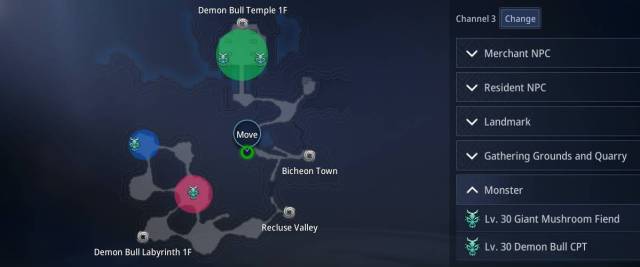 Don’t worry though, as the flower isn’t actually that hard to find. You can find the Moonlight Flower nestled in a small area near the center of the Crystalline Forest. Head west from Bicheon Town on the map until you hit a valley, and the Moonlight Flower should be there. Look at the map below—you’ll want to be where you see the “Move,” with the green circle.