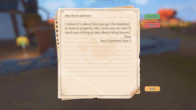 Early on during your time at Sandrock, you receive a letter in the mail from Elsie, who wants to teach you how to ride a horse. This usually happens during the first week of the game, so don’t worry about missing it. For us, we got the letter on day 8 of Summer.
